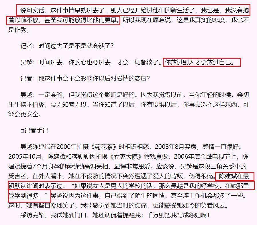 买完房子后,吴越已经做好了嫁给陈建斌的准备,可陈建斌却一直不求婚,直到2005年10月,在拍摄《乔家大院》时,他爱上了女主角蒋勤勤,凭借三寸不烂之舌将其拿下,转身和吴越分手。