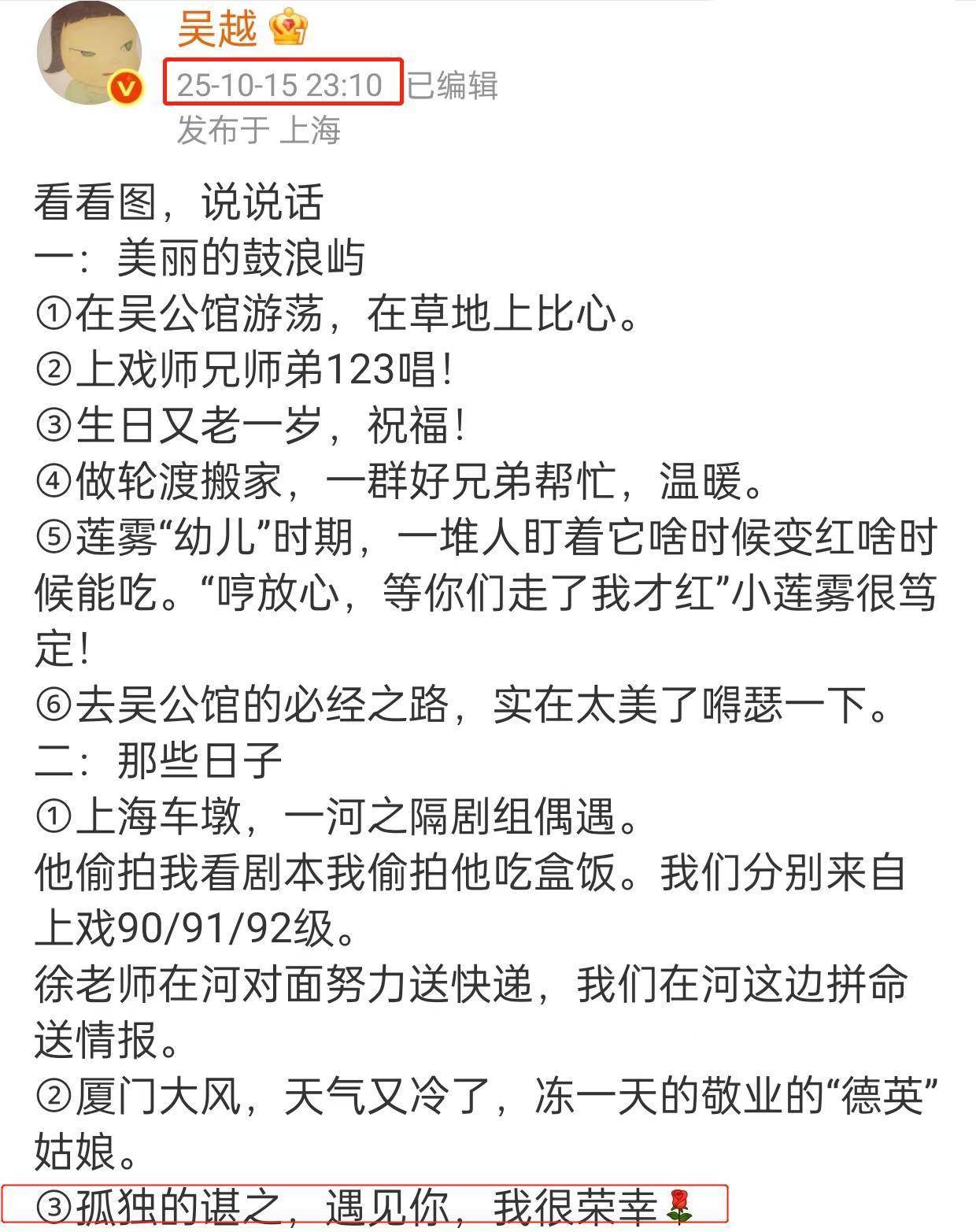 4月10号的生日,吴越愣是拖到10月15号才发庆生照,她像个小姑娘般碎碎念,和朋友一起度过,有美丽的风景相伴,更是与饰演的角色融为一体。