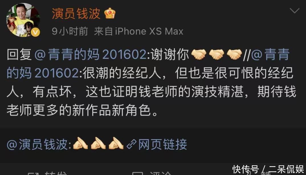 10月25日,钱波还在微博上回复了网友对他演的《红石榴餐厅》中经纪人的评价。他感谢了网友对他演技的认可,不过也有网友希望他以后能接一些好人的剧本。