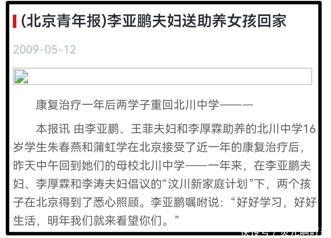 据李亚鹏介绍,女孩当年的情况十分糟糕,双腿截肢,是李亚鹏、王菲等人通过“汶川新家庭计划”给女孩提供帮助,朱春燕在北京接受了几十次手术和长达一年的康复治疗。