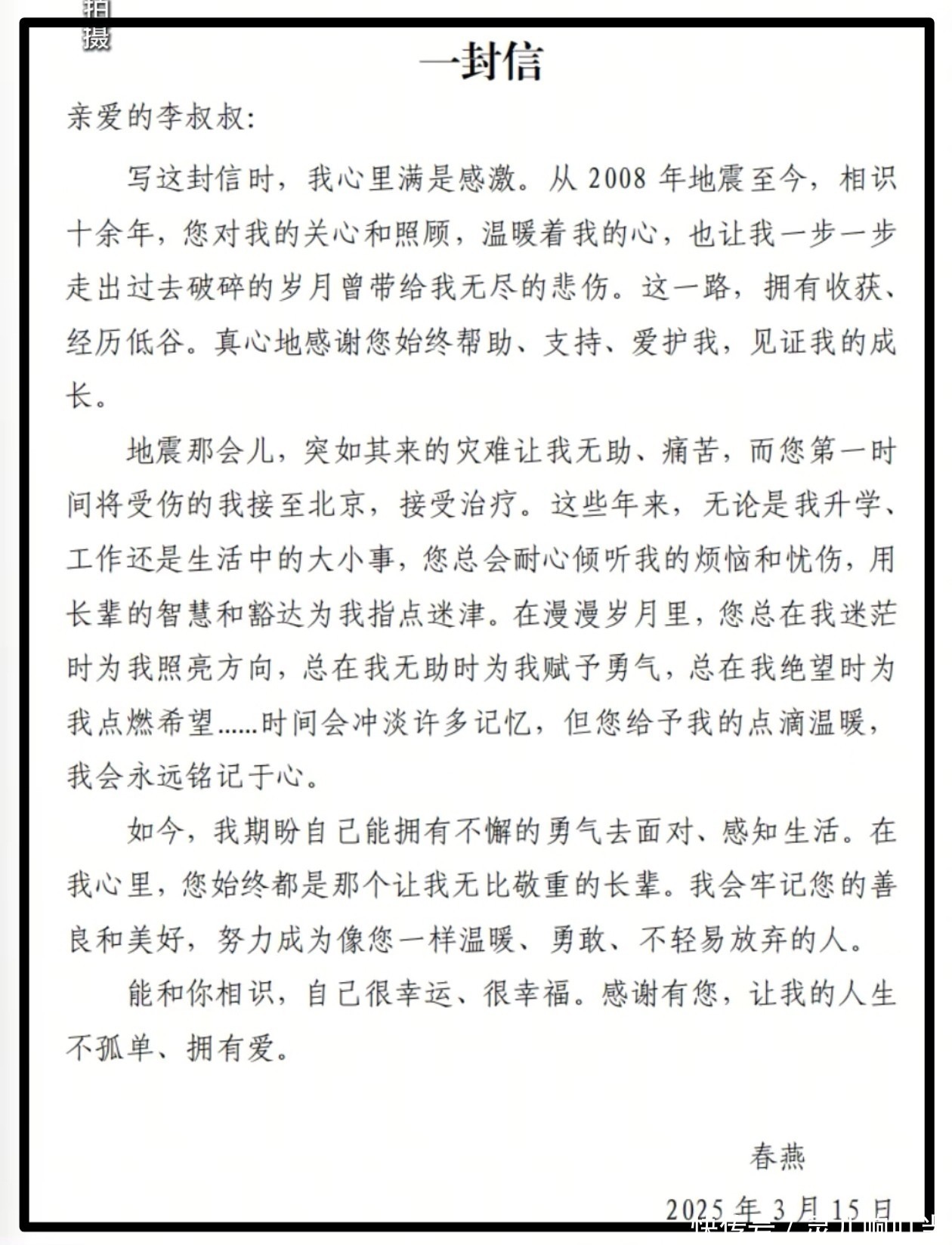 2025年3月份,朱春燕还给李亚鹏写过一封信,称李亚鹏为李叔叔,回顾了这些年来李亚鹏对她的照顾、关心和给予的温暖,让她从低谷和悲伤中走了出来。